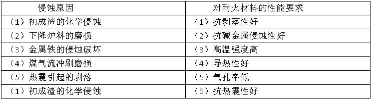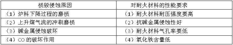 高爐爐身下部和爐腰的溫度高達1400~1600℃,是高爐出渣和金屬鐵形成的主要區域。從爐襯下部到爐腰的磚襯,既受下降爐料和上升高溫高壓煤氣的磨損以及溫度變化引起的熱沖擊,又受到FeO高堿度初渣的化學侵蝕,更為嚴重的是堿金屬和鋅蒸汽造成的炭素沉積和化學反應,使耐火磚組織脆化,失去強度。爐身下部、爐腰侵蝕原因及對耐火材料的基本性能見下表。