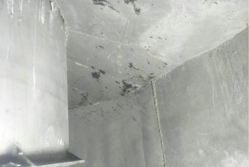 施工后的烘爐過程也是在賣家技術指導下進行了烘爐,烘爐周期在10天半,頭三天在100℃以內其中第一天溫度在30℃左右,第二天在60℃左右,第三天在80℃左右,最高烘爐溫度在550℃,經過烘爐后的耐磨澆注料出現了大部分部位的表面炸裂并帶有孔洞及長裂紋的情況以下是烘爐后所拍攝照片。后經我公司分析問題的原因在于以下幾方面,以警后患。