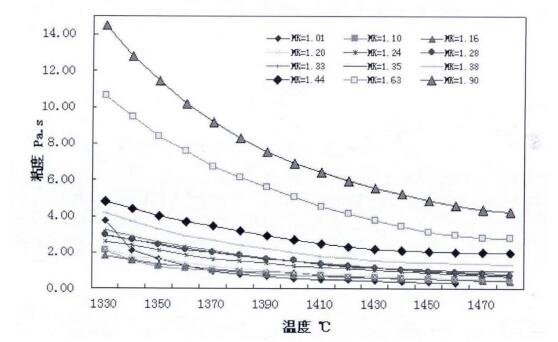 圖1表明,熔渣的粘度都隨溫度的升高逐步降低,但變化的斜率不同:酸度系數較低時,粘度曲線較平滑,特別是1390℃以上時,熔體粘度隨溫度升高的變化很小,說明熔渣的粘度對溫度的變化不敏感,有較寬的溫度適應范圍;隨著酸度系數的提高,熔體粘度曲線的斜率增大,溫度的稍微波動都會導致溶體粘度較大的變化,曲線變得較陡峭;在相同溫度條件下,酸度系數越大粘度越高。