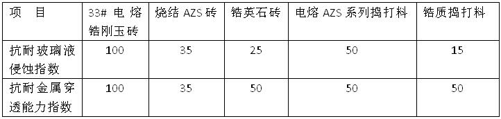 電熔AZS搗打料生產的關鍵是用原磚分所制得,內含月205玻璃相。電熔AZS系列搗打料玻璃相的存在使其在超過800℃后變成應變材料,在800~1300℃溫度范圍內材料的可塑性和粘附性有利于接縫在某些微弱位移的情況下保持密封,并使其與其含同樣玻璃相的電熔鋯剛玉磚鋪面磚之間形成可靠的中間隔層。能有效地防止發泡玻璃液滲入鋪面磚和襯層之間,避免“向上鉆孔”侵蝕,使池底壽命得以延長。下表為電熔AZS系類搗打料理化指標