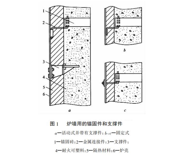 圖1支撐件是用螺栓與爐殼連接的。當(dāng)爐墻較高時(shí),采用該件與錨固件共同支持爐墻的自重,以防倒塌。支撐件從爐底工作面起,高度方向500mm處可安裝一排支撐件,再每隔1m左右安裝一排,依此類推。支撐件水平中心距為500~600mm;