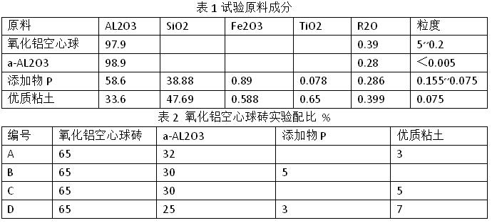 正常情況下氧化鋁空心球產品的主要原料是Al2O3,再配以5%左右的輔料。基質原料是a-Al2O3,這種基質料生產出來的空心球熱震穩定性相對不高。為此,采取骨料成分不變,基質料中加入富含SiO2 的原料添加物P,成型干燥后燒制,使基質料中的一部分形成一定數量的莫來石相,部分莫來石相代替部分剛玉相,可極大提高空心球產品的熱震穩定性能;添加物 P 是一種三石類原料,部分添加物 P 在燒成過程中發生分解形成莫來石和SiO2,多余的SiO2 與基質料中的 a-Al2O3 產生二次莫來石化反應,同時少部分未分解添加物 P 也起到改善基質的作用,可以提高制品的熱震穩定性。綜合考慮,制定A、B、C、D 4 種配比方案,通過性能等比較找出最優原料配比。試驗原料成分見表 1。氧化鋁空心球磚試驗配比表 2。