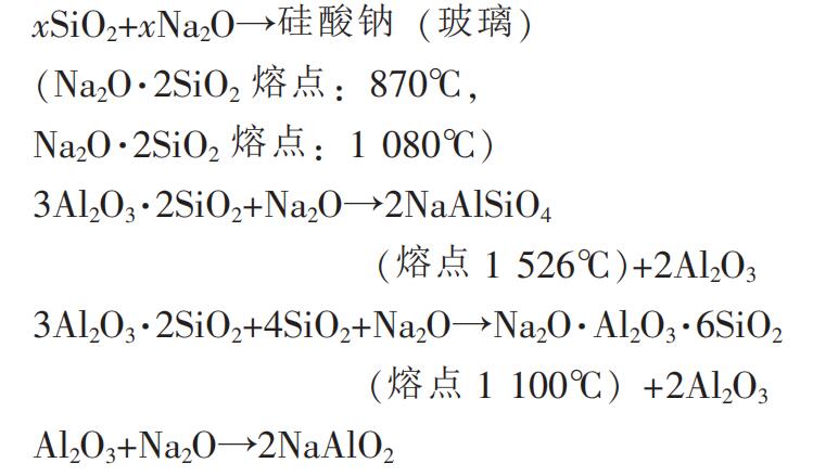 (2)黏土質磚和澆注料的礦物組成是莫來石(3Al2O3·2SiO2)、方晶石(SiO2)、 石英(SiO2) 等,由于 Na2O 的侵入引起下式的反應: