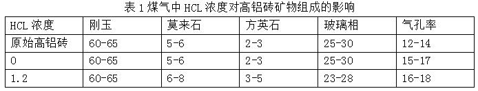 2:通過對不同HC1濃度煤氣侵蝕后高鋁磚的分析和檢測可以得出以下結論煤氣中的HCI氣體會促進部分硅酸鹽玻璃質和隱晶質鋁硅酸鹽轉變成莫來石 (3AL2O3·2SiO )和方英石 (Si0 ),高鋁磚表層剛玉和莫來石的顆粒結晶度明顯變差,氣孔率增大.