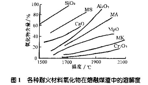 圖1為各種耐火材料氧化物在熔融煤渣中的溶解度。由圖1可知,Cr203在煤氣化爐渣(SiO2一CaO 系)及各種玻璃熔體中的溶解度比其他氧化物材料的溶解度要小得多。因而Cr203或含Cr203的耐火材料具有良好的抗鋼渣、有色冶煉渣、煤氣化爐渣、 油氣化爐渣和各種玻璃熔體熔蝕能力。Cr203熔體或Cr203,與爐渣反應生成的液相粘度比其他低熔物粘度大,這就阻止了熔渣沿毛細氣孔向磚體內部滲透,避免形成變質層而產生結構剝落。