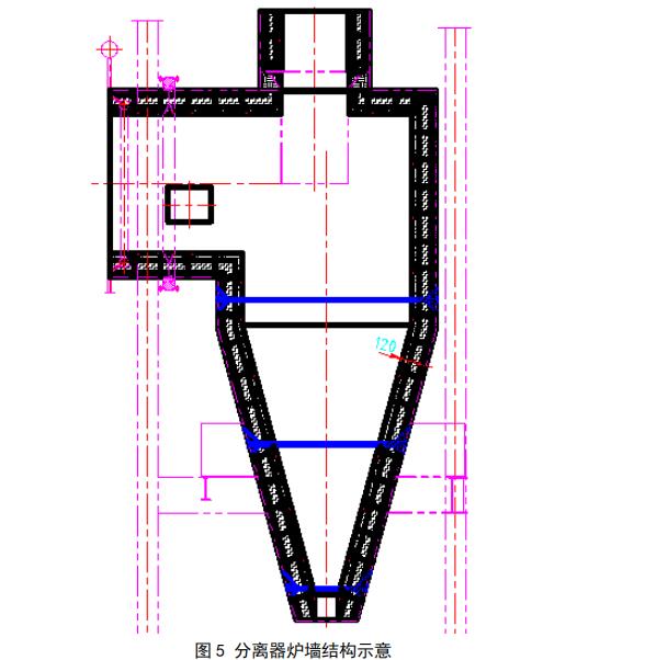 旋風分離器是循環流化床鍋爐最重要的部件,其性能的好壞直接影響鍋爐的性能。該部位工作溫度 900℃左右,煙氣流速高(23m/s),灰濃度高,磨損嚴重,頂部耐火材料易脫落。特別是進口煙道及靶區范圍內磨損更為嚴重,靶區范圍內澆注時只留橫向膨脹縫。在筒體、錐體內水平安裝了多層支撐托板,固接在金屬殼體的內壁上,用以支撐內部的耐磨保溫材料,實現分層卸載。耐火層材料應采用高強度耐磨耐火澆注料如圖 5。