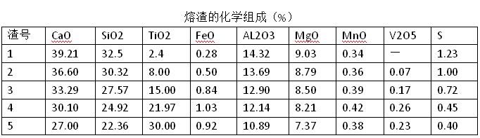 實驗用熔渣以攀枝花鋼鐵公司和重慶鋼鐵公司高爐現場渣加少量化學試劑配制,并熔煉成3~5mm的渣粒待用。渣的化學組成見表1.