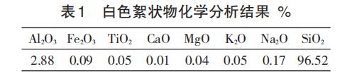 從試驗的總體情況來看,試樣燒制完成后,在排氣孔附近出現(xiàn)了很多白色的絮狀物質,該物質應該是從樣品內部揮發(fā)出來的反應生成物。對白色絮狀物進行化學分析,結果見表1,從表1中數(shù)據(jù)得知,白色絮狀主要是SiO2。