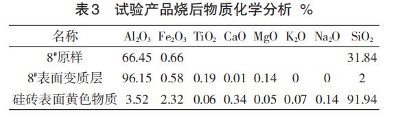 采用硅磚時發(fā)現(xiàn)表面凝結了很厚的一層黃色物質,且硅磚侵蝕嚴重,存在很明顯的脫落物,硅磚抗侵蝕前厚度為65.70 mm,侵蝕后厚度為61.88 mm,整體侵蝕率為5.8%。8#磚出現(xiàn)了很明顯的變質層,變質層厚度為2.5 mm。 對8#變質層的物質清理下來一部分用于分析,分析結果顯示如表3 所示。從檢測結果可以看出白色變質層中的AI2O3含量增加29.7%,SiO2含量減少29.84%