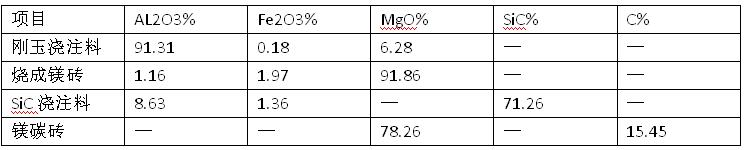 所用工業鈦渣的化學組成為:TiO 78%,FeO 5.98%,CaO 1.05%,SiO25.96%,A12O3 3.27%,MgO5.03%。剛玉澆注料、燒成鎂磚、SiC澆注料和鎂碳磚4種耐火材料的主要化學組成見表 1。
