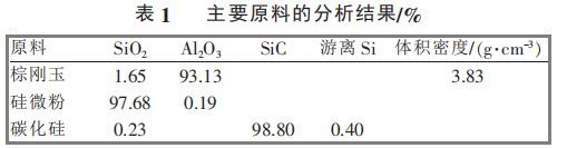 試驗所使用的原料是以棕剛玉為骨料,碳化硅、水泥、uf-SiO2、α-Al2O3 為基質,主要原料的分析結果如表1所示。
