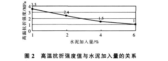首先選擇兩組水泥加入量,一組加 4%,一組加5%,各組中的uf-SiO2和α-Al2O3有所調整。試驗結果顯示,所有配方的常溫耐壓強度都大于80MPa, 但1 500℃下保溫0.5h的高溫抗折強度均小于1MPa,這說明水泥的加入量太大。為了驗證水泥對高溫抗折強度的確切影響,又進行了一組試驗。試驗方案為:將水泥量從1%逐漸增大到6%,α-Al2O3 固定不變,碳化硅的加入量固定為16%, uf-SiO2的量隨水泥量而調整以保持基質總量不變。試驗結果如圖2所示。