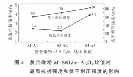 3.4 復合微粉中 uf-SiO2 和 α-Al2O3 的比例對高溫抗折強度和烘干耐壓強度的影響