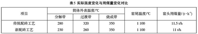 新配磚工藝將分解帶和過渡帶約47 m傳統耐火磚改為低導熱多層復合莫來石磚,對應部位筒體外表溫度下降50〜80℃,有效地降低了筒體外表散熱能耗損失,實際效果見表5。本次優化還帶來了另外兩個效果:一是因為低導熱多層復合莫來石磚的密度比原莫來石磚輕,在一定程度上減輕了窯體的自重,為增加物料負荷騰出了一定空間;二是改善了二檔輪帶與托輪運行環境二檔部位因窯筒體熱輻射強度大,輪帶與托輪一直處于高溫環境下運行,對托輪瓦與輪帶的安全運行有一定影響。在使用低導熱多層復合莫來石磚后二檔以后窯筒體表面溫度整體下降,改善了相應部位設備的運行環境。