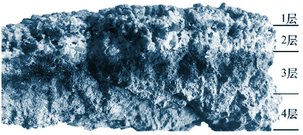 從燃燒器上取一塊由外到內(nèi)完整的襯體澆注料作為試樣,將殘襯試樣根據(jù)不同顏色從外到內(nèi)分為4層,如圖1所示。采用X射線衍射儀分析各層的物相組成,采用X射線熒光光譜儀分析各層的化學(xué)組成。