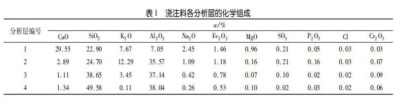 襯體澆注料各分析層的化學(xué)組成見表1。從表1中可以看出,1層、2層中含有大量的K鹽和 Na 鹽,Al2O3和SiO2含量明顯低于正常值,說明該處已經(jīng)被堿性物質(zhì)嚴(yán)重蝕損。