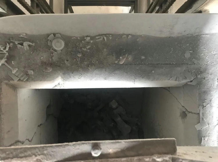 ③該鋁熔煉爐的投料方式是屬于半自動的,人工將鋁錠放入到提升機內(nèi),然后通過提升機將鋁錠提起到投料口,通過豎井直段進入熔煉爐內(nèi)部,豎井是長方體四周使用耐火澆注料砌筑,由于使用年限長豎井內(nèi)部的耐火澆注料在平時生產(chǎn)期間被鋁錠及熱沖擊已經(jīng)破壞出比較大也比較多的橫向縱向裂紋,已經(jīng)不能使用。