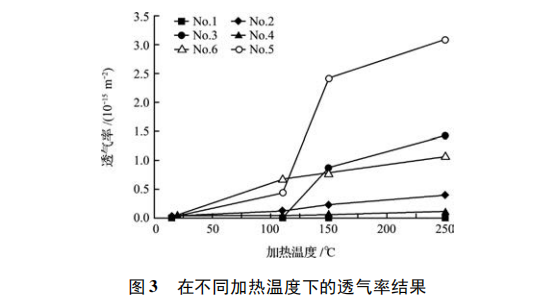 測定結果示于圖3根據這次測定的結果從養生到250 ℃加熱處理,沒有加入添加劑的試樣幾乎沒有透氣性。為了提高養生體脫水時的透氣率,加入了特殊添加材料XNo.2試樣No.5 No.6試樣在從養生到加熱250 ℃時透氣性有所提高。另外發現加入了有機纖維A No.3No.5試樣150 ℃加熱時透氣率提高很大。加入了有機纖維BNo.4 試樣和 No.6 試樣,在150 ℃250 ℃加熱時透氣率提高。并用特殊添加材料和有機纖維的No.5 試樣和No.6 試樣,由于疊加效果的作用,透氣率大幅度提高。尤其是No.5 試樣,150 ℃ 加熱后透氣率顯著提高,特殊添加材料和有機纖維A并用特別有利于形成連通氣孔。