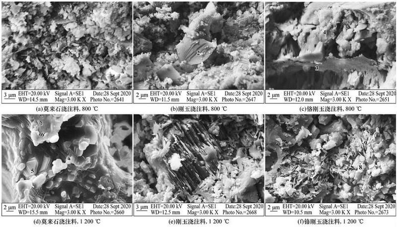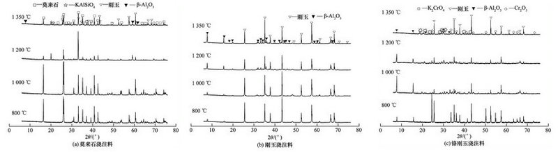 2:結果與討論,1示出了莫來石、剛玉和鉻剛玉澆注料經800100012001350℃抗堿侵蝕后試樣的XRD圖譜。可知,隨著溫度的升高,莫來石試樣的主要物相為莫來石、剛玉,剛玉試樣的主要物相為剛玉,鉻剛玉試樣的主要物相為剛玉、Cr2O3,說明三種澆注料侵蝕后的主要物相均沒有變化。800℃時,莫來石、剛玉和鉻剛玉三種澆注料與堿反應后的對應產物KALSiO4、β-AL2O3K2CrO4,但衍射峰強度比較低,生成量較少,堿對材料的侵蝕不明顯;隨著溫度升高,KALSiO4、β-AL2O3 的衍射峰逐漸增強,說明K2CO3對莫來石和剛玉澆注料的侵蝕程度隨溫度升高而增大,其中β-AL2O3KALSiO4K2CrO4物相在1350℃ 時的衍射峰都較高,生成量多,而主物相的衍射峰明顯降低,說明三種澆注料在1350℃被堿侵蝕嚴重。