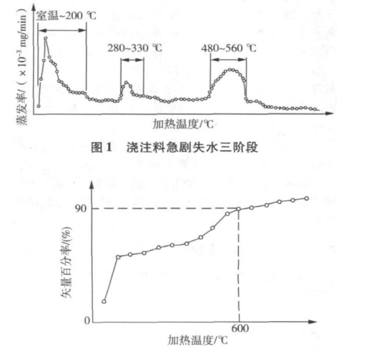 由以上的脫水反應方程式看出,水泥中的石水化合物和骨料中的結合水的脫水溫度與澆注料急劇失水階段