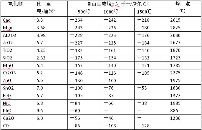 熔融金屬和耐火材料之間的氧化還原反應(yīng)的可能性,可以從熱動力學(xué)角度推斷出來。自由生成焓的值(—ΔGi)就表示這種反應(yīng)的程度。(表)中示出氧化物生成的相應(yīng)焓的值。自由生成焓的值(負(fù)數(shù))越大,氧化物的穩(wěn)定性就越高。(表)內(nèi)示出的氧化物中,CaO和MgO最穩(wěn)定,也就是說,熔融的鈣和鎂能使多余的氧化物還原出來。