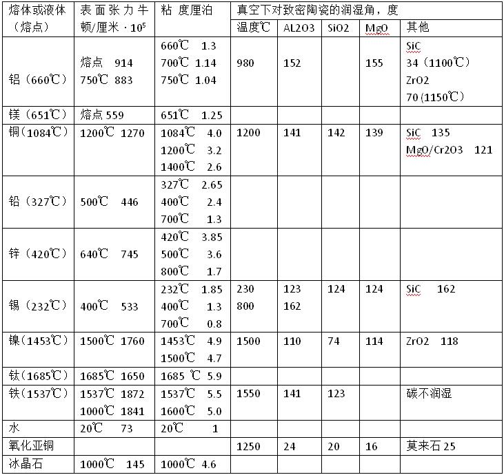 耐火材料的潤濕性取決于兩相系之間的界面應(yīng)力。潤濕性根據(jù)潤濕角確定。對潤濕性發(fā)生影響的因素很多,包括氣氛、接觸反應(yīng)(有時與時間有密切關(guān)系)、雜質(zhì)、合金元素和耐火材料的氣孔結(jié)構(gòu)等等。例如銅熔體對AL2O3的潤濕角,在熔體中的氧化亞銅含量升至5%時,會急劇變小,由163°下降為25°。被金屬熔體浸漬的程度,取決于下列因素;熔體的表面張力和粘度、耐火材料的潤濕性和氣孔的孔徑。表2已經(jīng)有色金屬熔體的有關(guān)數(shù)據(jù)一一列出。有色金屬熔體的粘度低于鐵熔體,有的與水的粘度相近。