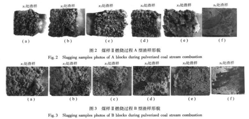 在濃度差作用下,表面的CO2 向顆粒內部擴散,反應生成CO而CO則向周圍環境擴散與氧進一步反應生成CO2,因此掉落在x2 處耐火板上的煤粒由于與氧的接觸空間少,易形成還原性的灰渣環境,導致灰渣在較低的溫度下產生熔融,造成了較為嚴重的結渣現象。由于受還原性氣氛作用,x1 , x2 處煤灰熔融性較為明顯,基本上形成了大渣塊;盡管 x3 , x4 處的測點溫度較高 , 但是仍為顆粒狀灰渣 , 這說明此兩處灰渣表面的灰分熔融程度較低,流動性較差,不足以聚合成大渣塊.。圖3為燃燒過程不同溫度測點處碳化硅耐火板向火側的結渣渣樣形貌. 耐火板上的灰渣均比較松散,與碳化硅質耐火板黏結作用較弱,尤其 x6 處熔融煤灰已成為積灰,輕輕掃去,即可見到耐火板本色。但是受還原性氣氛作用,x1 , x2 處煤灰熔融性較為明顯,基本上形成了大渣塊; x3 , x4 處的灰渣,仍為顆粒狀灰渣,但與圖 2對應位置處的渣樣比較可知,該煤樣熔渣在 A型耐火板上的黏結作用明顯強于 B型耐火板. x3 , x4 處 A型耐火板上的冷卻熔渣收縮明顯,熔融狀的玻璃態物質較好地潤濕了渣粒灰渣處的A型耐火板,并使渣、板黏連在一起,B型耐火板除x1 , x2除外,渣粒之間和渣、板之間的這種潤濕作用不明顯。