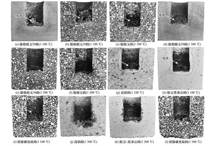 選取目前危廢處置回轉窯用幾種典型耐火材料50鉻鋯剛玉磚、30鉻鋯剛玉磚、鉻剛玉磚、高鋁磚、剛玉莫來石磚和鋁鉻碳化硅磚,進行了抗熔渣侵蝕性能研究試驗熔渣取自合肥某危廢處置回轉窯,其化學組成()為Na2O 13.49%,MgO 3.19%AL2O3 7.18%,SiO2 12.86%,P2O5 6.43%SO3 14.67%,CL- 7.25%K2O 3.25%,CaO 9.26%,TiO2 6.85%,Fe2O3 7.94%ZnO 1.17%,PbO 3.07%。熔渣物相組成復雜,主要物相為NaCLNa2SO4。將試驗磚制成內孔尺寸為φ25mmX30mm、外形尺寸為70mmX70mmX70mm的坩堝,加入15g危廢熔渣,分別在11001300保溫24h。沿坩堝孔中心軸剖開,觀察剖面的侵蝕情況,并測量各層厚度。
