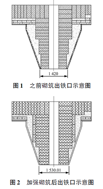 出鐵口袖墻渣線部位和出鐵口轉角墻處侵蝕比較嚴重,袖墻使用600mm的鋁碳化硅碳磚和高檔預制塊磚加強砌筑,同時里側再加厚砌筑150mm鋁碳化硅碳磚。出鐵口轉角墻使用寬厚度的鋁碳化硅碳磚每層交叉砌筑,起錯縫和加固作用。出鐵口袖墻砌墻高度在鐵水液面以上時支模澆注小拱頂。出鐵口加強砌筑情況如圖1和圖2所示。
