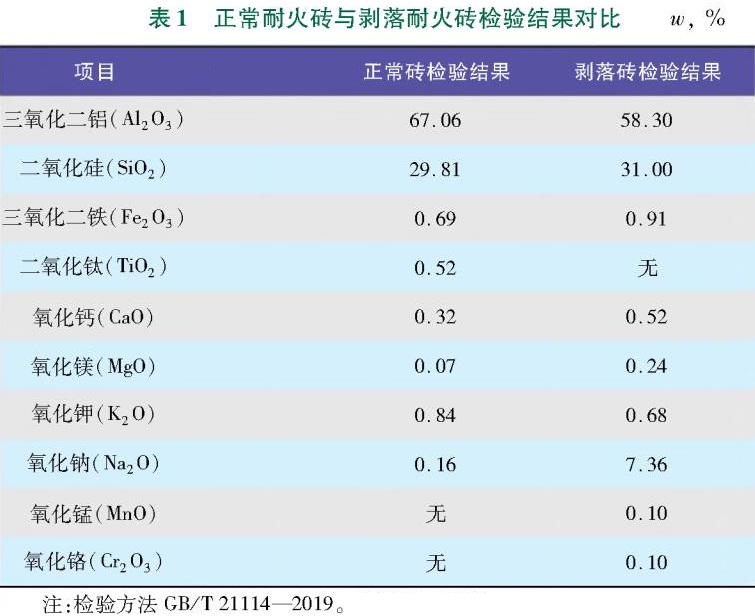 取樣剝落的耐火磚,送往第三方檢測機構進行成分的全組分分析,分析結果對比見表1,從表1可見:裂解爐襯里用隔熱耐火磚主要由三氧化二鋁AL2O3(約67%)和二氧化硅SiO2(約30%)組成。從分析結果可以看出,剝落耐火磚與正常耐火磚的化學成分有較大差異,主要是:三氧化鋁含量從67%下降到58%,氧化鈉Na2O含量達到了7.36%,相比正常耐火磚中0.16%的含量大幅增加,顯然這一部分Na2O是在使用過程中帶入的。對耐火磚來說Na2O的危害較大,因為其在高溫條件下會形成玻璃相,且在富鈉區域產生化學反應生成鋁酸鹽等堿性化合物,從而導致輕質磚出現熔損,并產生開裂、剝落現象。