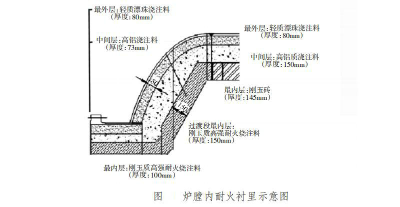 由于硫燃燒爐筒體部分耐火襯里采用內砌外澆結構,襯里總厚度為380mm。最內層采用剛玉磚,過渡段最內層采用剛玉質高強耐火澆注料。剛玉質高強耐火澆注料的強度、耐熱溫度以及抗沖刷和侵蝕性能顯然低于剛玉磚,過渡段最內層采用剛玉質高強耐火澆注料顯然是不合適的。