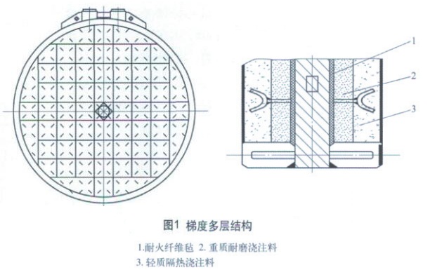 閥板一般采用單層重質(zhì)不定型耐火澆注料覆蓋(如圖1所示),可以耐高溫,耐熱風(fēng)沖刷,但重質(zhì)耐火澆注料熱導(dǎo)率高,隔熱效果較差,故閥板需采用大量循環(huán)水冷降低金屬構(gòu)件溫度。另一方面,循環(huán)水冷不利于不定型耐火澆注料的高溫?zé)Y(jié)而陶瓷化結(jié)合,導(dǎo)致耐火澆注料耐高溫性能較差。也有生產(chǎn)人員采用單層輕質(zhì)隔熱耐火澆注料,有隔熱效果,但是耐熱風(fēng)沖刷性能較差,產(chǎn)品壽命較短。單層覆蓋耐火澆注料結(jié)構(gòu)單一,施工工藝簡單,但節(jié)水、節(jié)能、使用壽命及應(yīng)用效果都較差,這是目前閥板存在的問題。