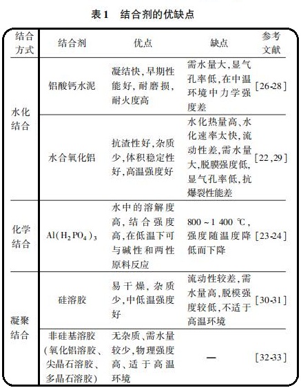 各種結(jié)合劑的優(yōu)缺點(diǎn)如上(表1)所示,鋁酸鹽鈣水泥凝結(jié)時(shí)間短,脫膜強(qiáng)度高,在高溫環(huán)境中具有良好的力學(xué)強(qiáng)度,但其卻不適于中溫環(huán)境,而磷酸鹽和硅溶膠則適用于中低溫的工作環(huán)境。水合氧化鋁、硅溶膠和非硅基溶膠均具有雜質(zhì)少的優(yōu)點(diǎn),有利于提高澆注料的純度,從而增強(qiáng)其物理性能。 此外,鋁酸鈣水泥、水和氧化鋁和硅溶膠均需水量較大, 導(dǎo)致澆注料的顯氣孔率低, 抗爆裂性能差。
