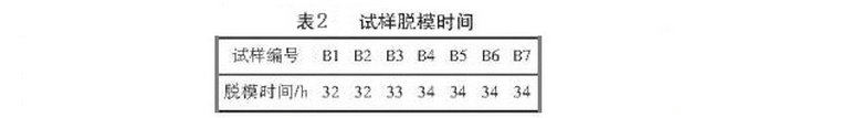 工業磷酸結合試驗過程,將按照表內的配料,放入攪拌鍋中攪拌2min,加入磷酸混煉3min,搗打成型為40mmX40mm160mm的試樣,在室溫養護,終凝后脫模,記錄脫模時間,然后再130℃干燥箱中干燥24h,于1200℃分別保溫3h熱處理。以下表2是試樣的脫模時間: