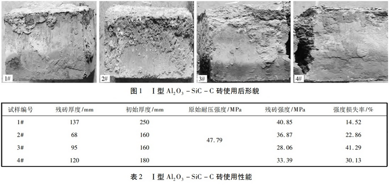 某鋼廠采用一包到底工藝,高爐受鐵、鐵水運輸、KR攪拌脫硫等操作完全在鐵水包內進行。目前鐵水包容量為300 t210 t,KR脫硫率為100%,脫硫攪拌頭轉速120160 rad /min ,脫硫時間2025 min,脫硫劑為石灰+氟化鈣,噸鐵消耗1316 kg。前期選Al2O3SiC C磚作為鐵水包的工作襯,侵蝕速率達0.6 mm /爐次,包壁侵蝕不均勻,尤其是渣線部位侵蝕嚴重。為研究高脫硫比鐵水包內Al2O3SiCC磚的侵蝕機理,提高鐵水包在線運行的安全性,需對Al2O3SiCC磚進行性能分析。Al2O3SiCC磚使用后形貌及實際性能分別見圖1和表2