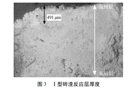 3 Al2O3SiCC 磚使用后磚渣反應層厚度。可見,拆解后的Al2O3SiCC 反應層厚度很薄,說明反應產生的低熔物較多,磚面幾乎沒有保護層,導致低熔物不斷生成,連續被鐵水沖刷消耗,侵蝕速度大大增加