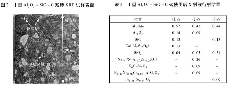 可見,Al2O3SiCC磚在鐵水包包嘴和圍罐兩處鐵水沖刷較嚴重的部位受損嚴重,同時殘磚耐壓強度損失較大,表明Al2O3SiCC磚高溫狀態下抗鐵水沖刷性能不佳。對拆除的Al2O3SiCC磚進行物相檢測,試樣表面及檢測位置見圖 2。衍射結果見表3