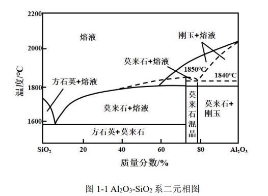 耐火澆注料是由一定級(jí)配的骨料、細(xì)粉、結(jié)合劑和外加劑按一定比例組成的耐火混合料,因其具有生產(chǎn)工藝簡(jiǎn)單、生產(chǎn)周期較短、節(jié)能等優(yōu)點(diǎn)被廣泛使用。 鋁系列耐火澆注料是由 Al2O3SiO2作為基本化學(xué)組成的耐火澆注料。鋁系列耐火澆注料的相組成可以從 Al2O3-SiO2 系相圖得到。從圖1-1可以看出,Al2O3的熔點(diǎn)為2050 ℃SiO2的熔點(diǎn)為1723 ℃。在該系統(tǒng)中唯一穩(wěn)定的二元化合物為莫來(lái)石其化學(xué)組成為3Al2O3·2SiO2(Al2O371.8%SiO228.2%),莫來(lái)石的熔點(diǎn)為1850 ℃。由于莫來(lái)石的存在,系統(tǒng)被劃分為兩個(gè)子系統(tǒng):SiO2-莫來(lái)石子系統(tǒng),固化溫度為1595 ℃,共晶點(diǎn)組成接近SiO2一側(cè),以及Al2O3-莫來(lái)石子系統(tǒng),固化溫度為1840 ℃共晶點(diǎn)組成接近Al2O3一側(cè)