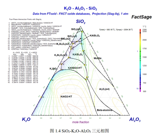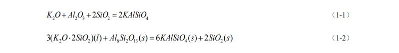 由三元相圖1.4可知,在1000 ℃下Al2O3-SiO2質耐火材料在使用過程中會與K2CO3反應形成白榴石(KAlSi2O6)、鉀霞石(KAlSiO4)兩種堿性礦物,這類礦物在耐火料內部產生體積膨脹效應,同時產生玻璃相,使耐火材料從內部造成破壞。