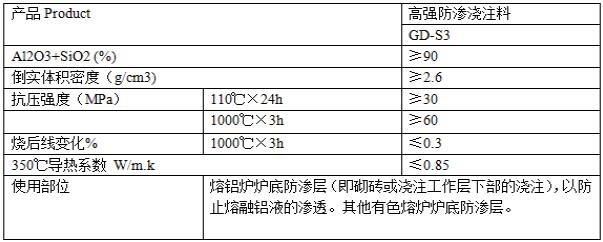 鋁電解側(cè)部砌筑傳統(tǒng)用耐火磚,在使用中液體電解質(zhì)滲透時(shí)易破壞,防滲澆注料選用合理的鋁硅系原料,引入復(fù)合結(jié)合劑和多種添加劑,混煉澆注鋁電解槽側(cè)部,當(dāng)液體電解質(zhì)從碳磚縫隙滲出時(shí)會反應(yīng)生成致密的玻璃體狀霞石,阻擋延續(xù)滲入,并具有強(qiáng)度。體密小、導(dǎo)熱系數(shù)低,施工方便等特點(diǎn)。