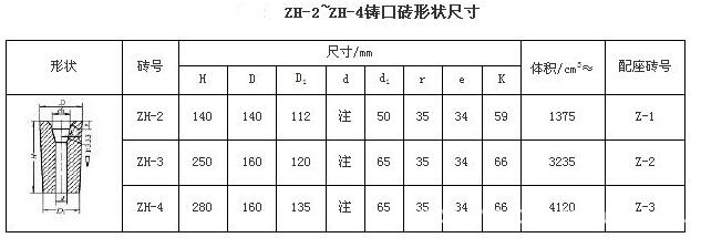 不澆注時水口磚和塞頭磚呈線接觸,保證不漏鋼。水口磚上口是弧面形,便于開啟、關閉水口及減小鋼水流動的阻力,下段是直線段以穩定注流。其材質與塞頭磚相近,可采用粘土質、高鋁質、鎂質、鎂鉻質及鋯質的。澆注沸騰鋼及高錳鋼時黏土質的水口易被侵蝕,故采用鎂質或高鋁質水口磚。鎂質水口耐侵蝕性強但導熱性也強,澆注中易產生結瘤。